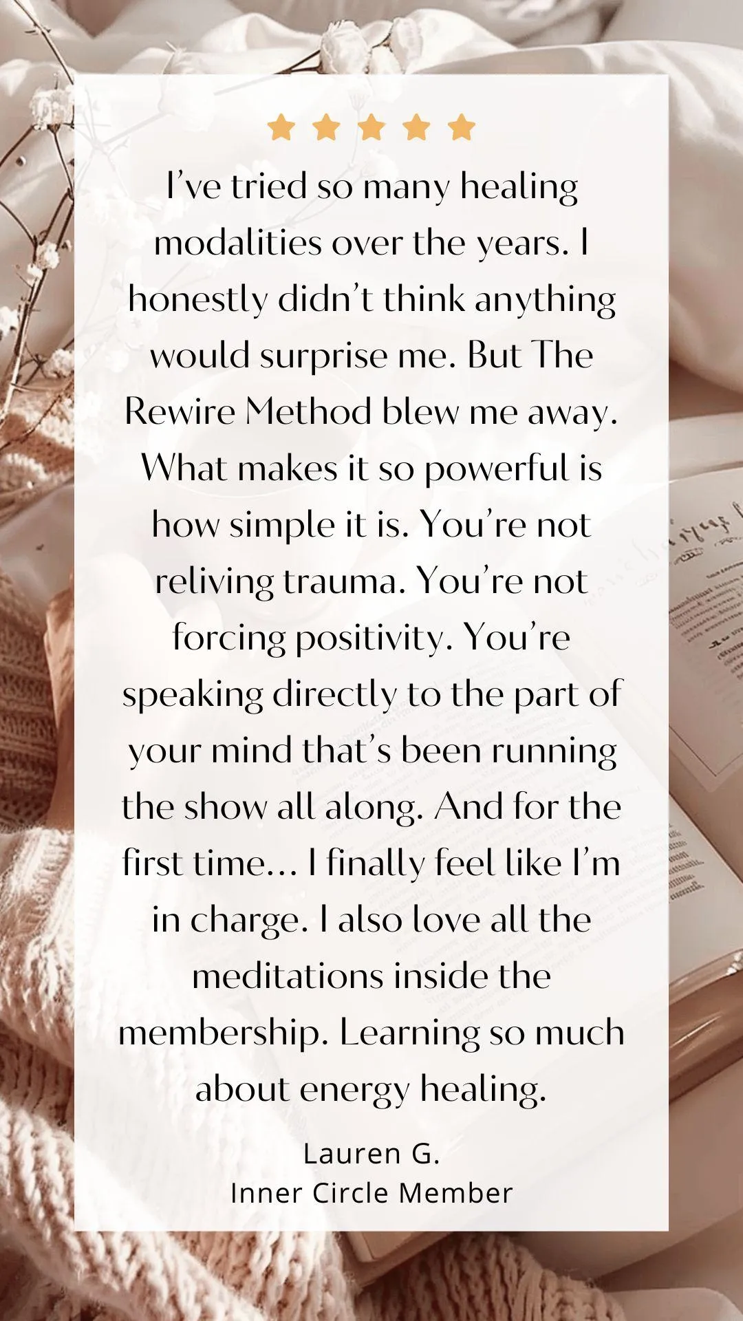 Inside the Inner Circle, you’ll gain access to years’ worth of powerful tools, belief work, healing sessions, and deep subconscious training — all designed to help you align with your highest self and create your dream life from the inside out.
